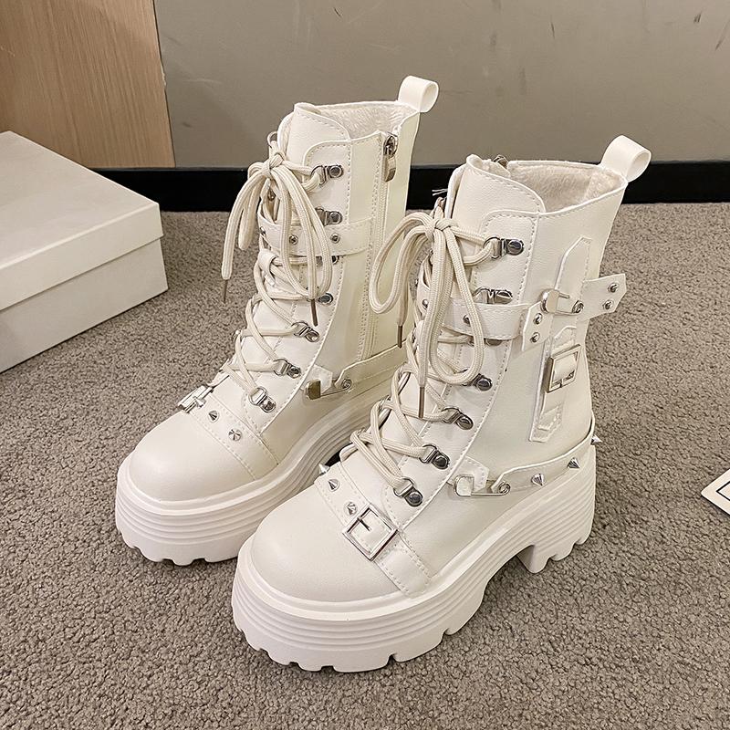 Модные Новые Женские Меховые Ботильоны на Толстой Подошве Кожаные Боевые Мотоциклетные Ботинки Осень Зима Теплые Плюшевые на Высокой Платформе Зимние Ботинки Женские 10СМ 34 бежевый