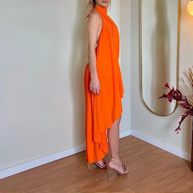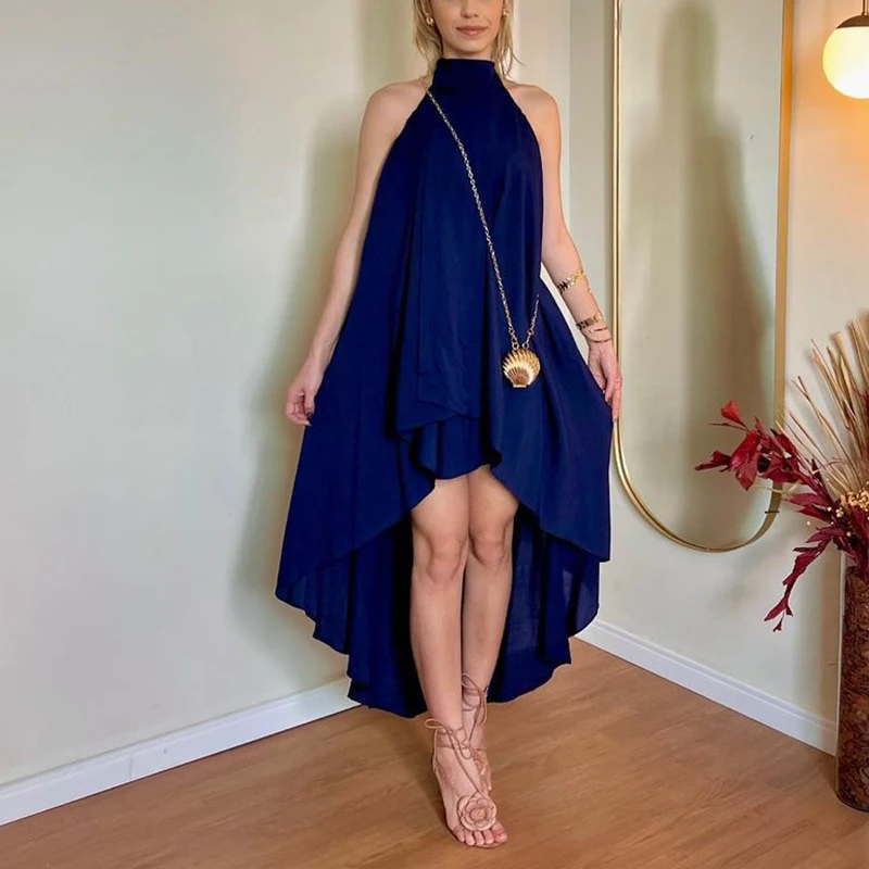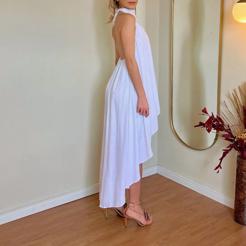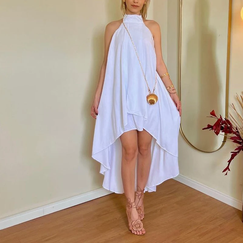 Модные Повседневные однотонные платья-трапеции, Привлекательное платье с лямкой на шее и большим подолом, блестящее элегантное платье с открытой спиной, праздничное пляжное платье неправильной формы