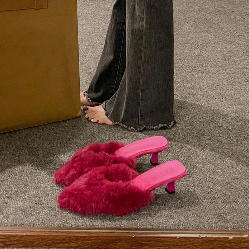Модные Роскошные Мюли на Каблуке-Рюмочке с Мехом Женские Розовые Сексуальные Тапочки Женские Остроносые Шпильки Плюшевые Сандалии Зимняя Вечерняя Обувь 40 роза розовый