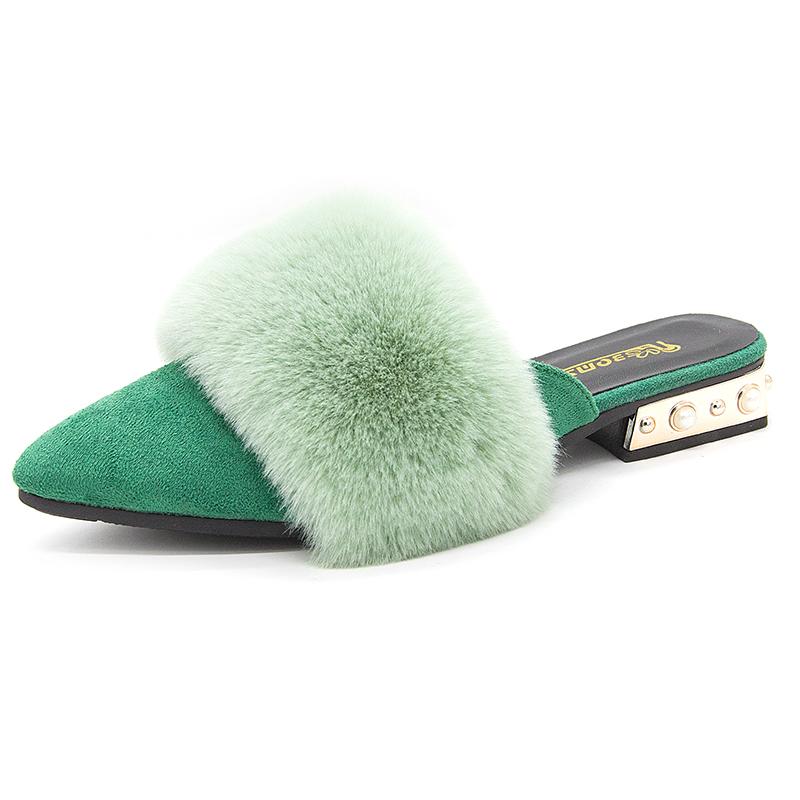 Модные Роскошные Пушистые Меховые Мюли Женские Элегантные С Острым Носком Жемчужные Каблуки Шлепанцы Женские Вечерние Туфли для Вечеринки Красного Зеленого Цвета 35