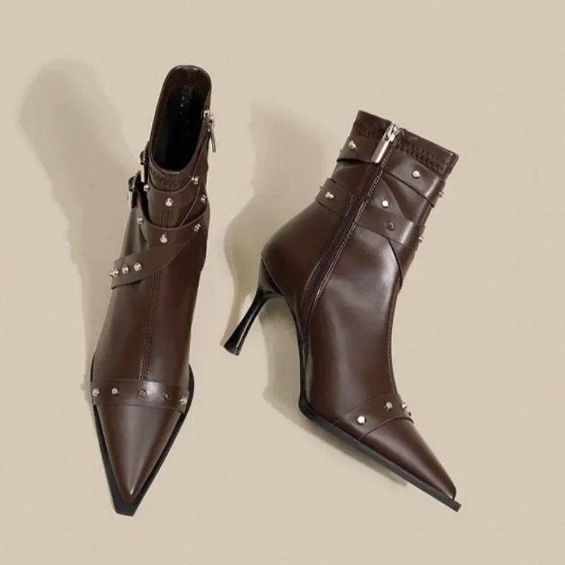 Модные Сексуальные Сапоги до Колена 2024 Зимние Сапоги Дизайнерский Бренд Супер Высокие Тонкие Каблуки с Заклепками Ретро Мода Крутая Женская Обувь Размер 39 35 коричневый