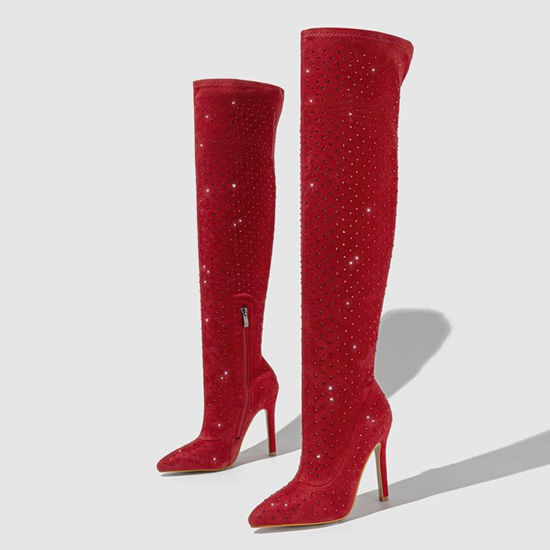 Модные ботфорты до бедра на молнии Женские красные ботильоны из эластичной ткани со стразами, с острым носком и на шпильке, выше колена 42 красный