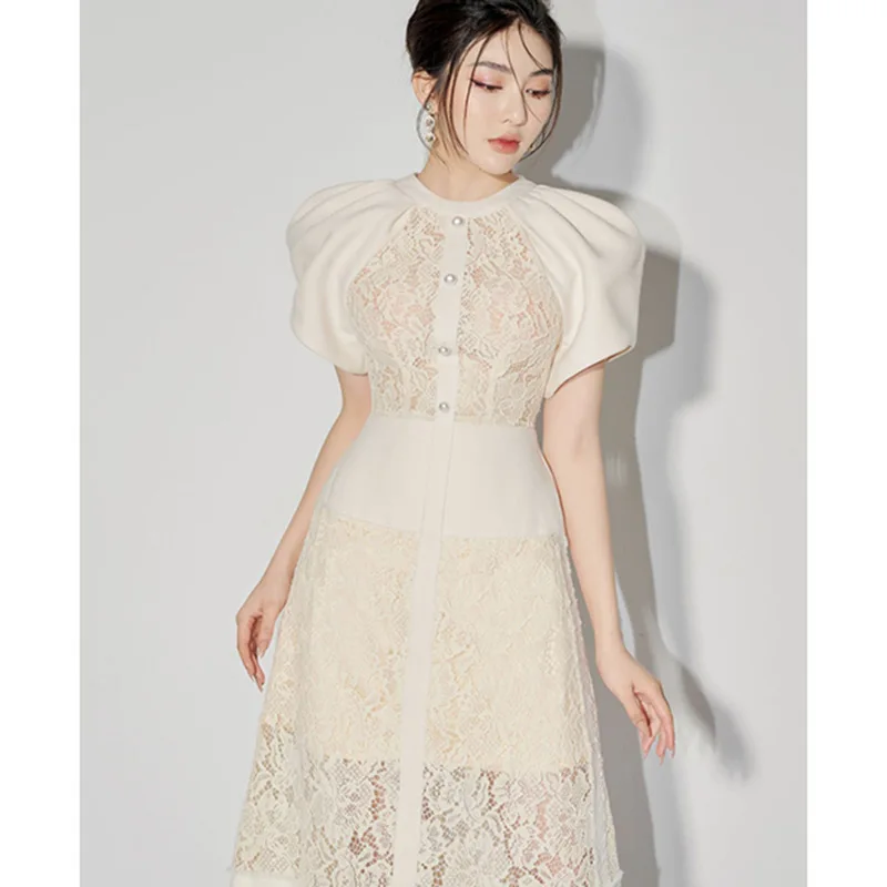 Модные вечерние платья, женская одежда, летнее кружевное платье в стиле пэчворк, женское элегантное платье-трапеция средней длины с пышными рукавами и присборенной талией