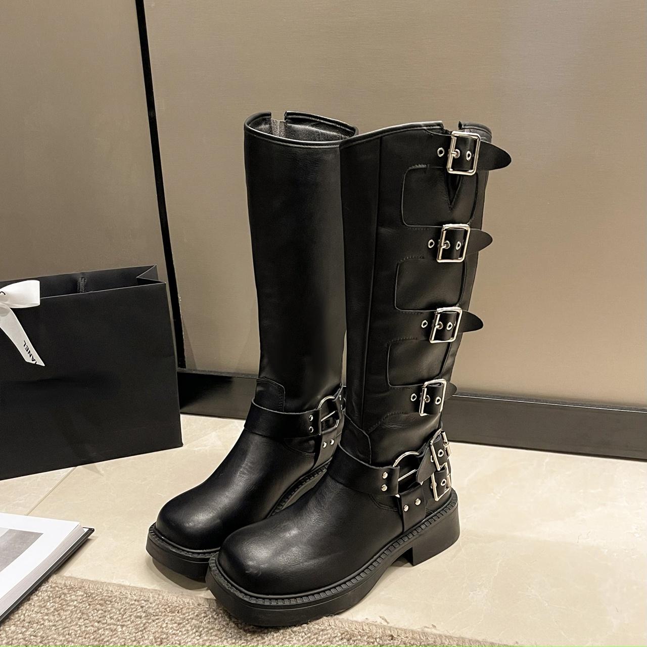 Модные готические ботфорты до колена на платформе с пряжками, женские боевые ботинки с шипами, зимние коричневые ботинки средней длины для женщин, мотоциклетные боты 37 чёрный