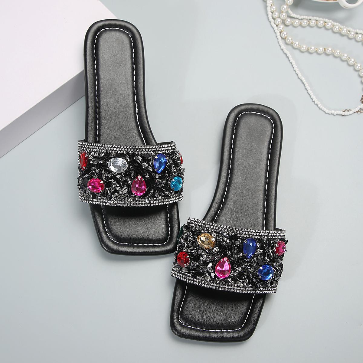Модные женские роскошные пляжные шлепанцы для отдыха на природе, летние тапочки большого размера с кристаллами и квадратным носком, плоские тапочки, женская обувь 36 чёрный