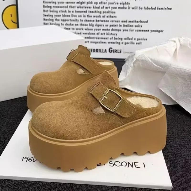 Модные женские хлопковые тапочки Новые зимние тапочки с закрытым носком Модные замшевые тапочки с круглым носком и толстой подошвой на пряжке Женская обувь 40 хаки