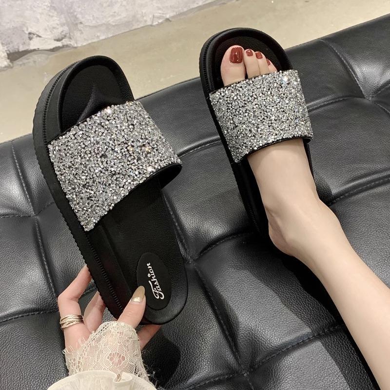 Модные крутые шлепанцы женские летние нескользящие на толстой подошве-маффине, универсальные шлепанцы на танкетке, пляжные туфли со стразами, тренд 40-41 Fits 39.40