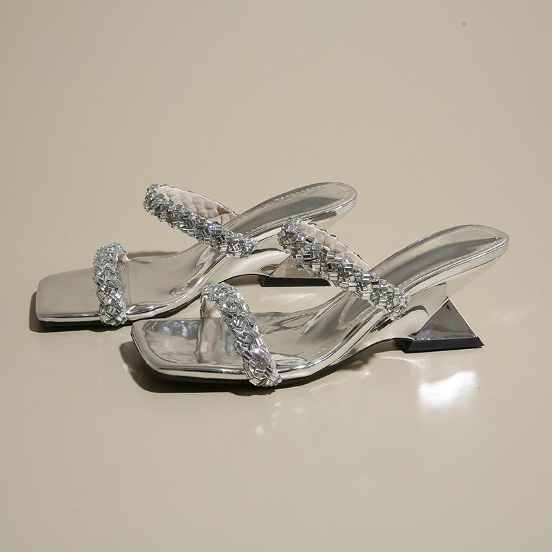 Модные летние новые шлепанцы с открытым носком, женская уличная обувь, темпераментный квадратный носок, стразы, прямой ремешок, танкетка 40 серебряный