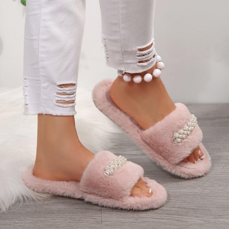 Модные мопсы из жемчужного хлопка Зимние Новые Круглый носок Открытый носок Плюшевая платформа Противоскользящие Износостойкие Балетки 43 розовый
