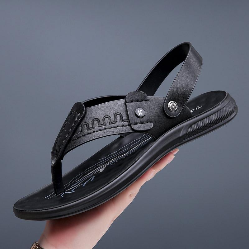 Модные мужские кожаные тапочки 2024 года, летние люксовые брендовые мужские шлепанцы, мягкие пляжные туфли двойного назначения для дома и отдыха, размер 38-44 44 чёрный