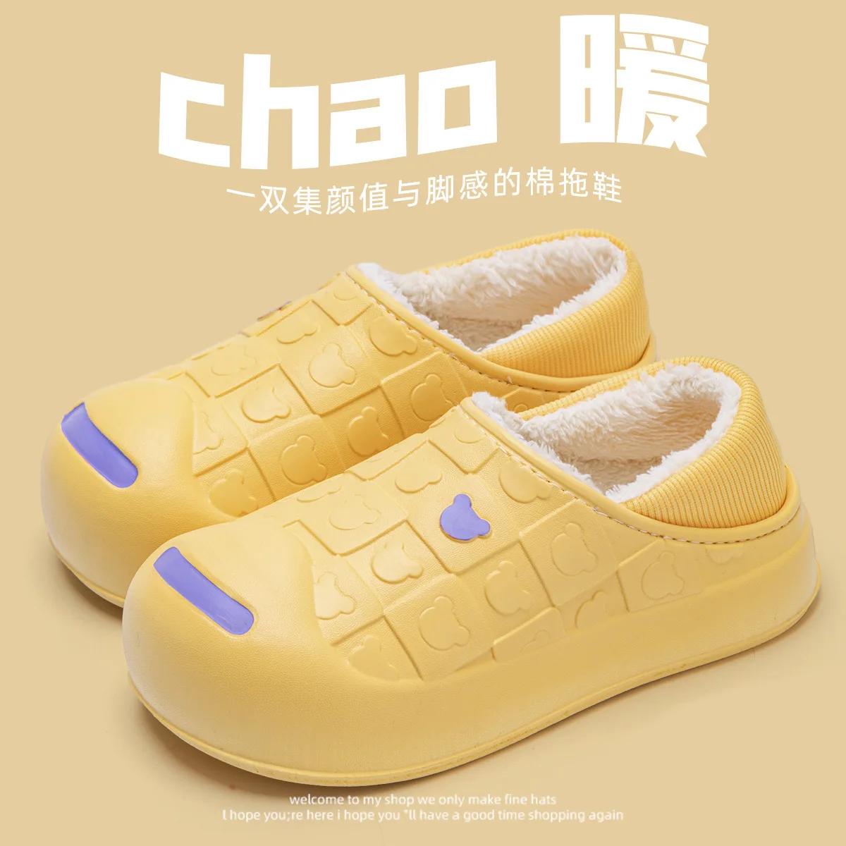 Модные мужские тапочки, зимние, для пар, водонепроницаемые, нескользящие, с покрытием на пятке, теплые, мужские плюшевые тапочки, женские, повседневные, из хлопка 44 -45(Suit EU43-44) жёлтый