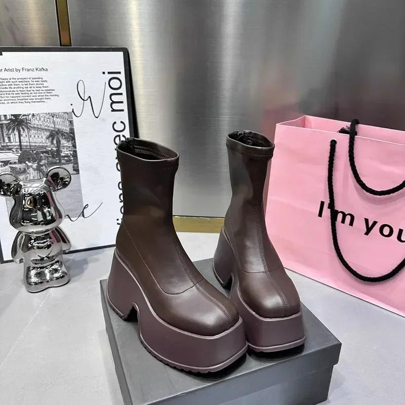 Модные новые женские туфли, модные туфли с молнией сзади, на высокой платформе и толстой подошве, элегантные женские короткие ботильоны, женские зимние короткие ботильоны 39 коричневый