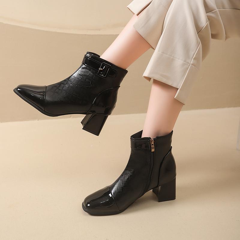 Модные осенние ботильоны зимние новые квадратный носок панельные лакированная кожа боковая молния металлическая пряжка нескользящие блочные каблуки 41 чёрный