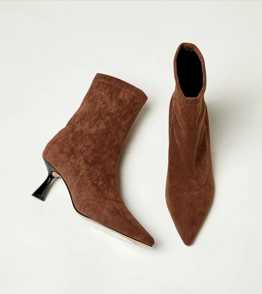 Модные осенние ботильоны из мягкой искусственной замши на высоком каблуке в стиле ретро, женские туфли-лодочки с острым носком, модные женские туфли на шпильках для вечеринок, туфли на тонком каблуке 39 коричневый
