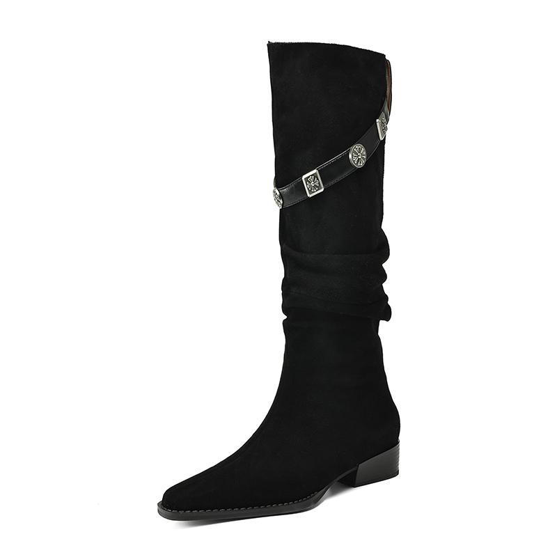 Модные осенние женские ботинки однотонные из коровьей замши с плиссировкой зимняя женская обувь элегантные высокие ботфорты из натуральной кожи челси 40 чёрный