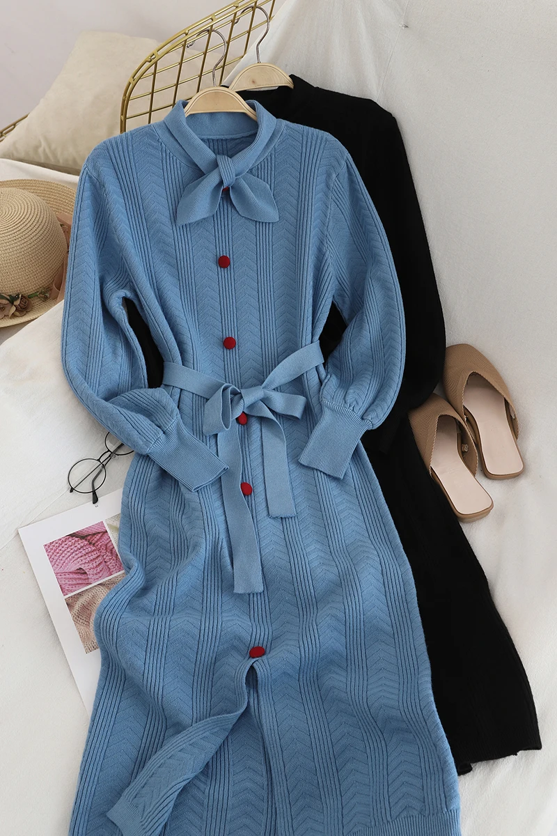 Black/Blue Bow Collar Knitted Dress Women Casual Long Sleeve Single Breasted Dresses Female Vestidos With Sashes Autumn Winter