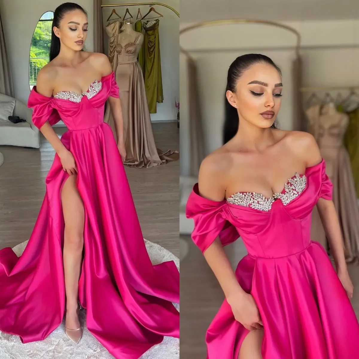 Модные розово-розовые платья для выпускного вечера по индивидуальному заказу с открытыми плечами и воротником из бисера Вечерние платья со складками и разрезом Вечернее длинное специальное вечернее платье