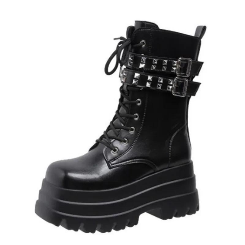 Модные теплые ботильоны на высокой платформе 9 см для женщин, осень-зима, нескользящие, боевые, панк, меховые, с пряжкой, кожаные мотоциклетные ботинки 2024 35 чёрный