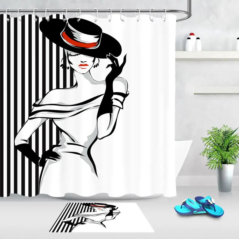 Модные черно-белые занавески для ванной в полоску для девочек, водонепроницаемая полиэфирная ткань, моющаяся занавеска для душа в ванной комнате с крючками