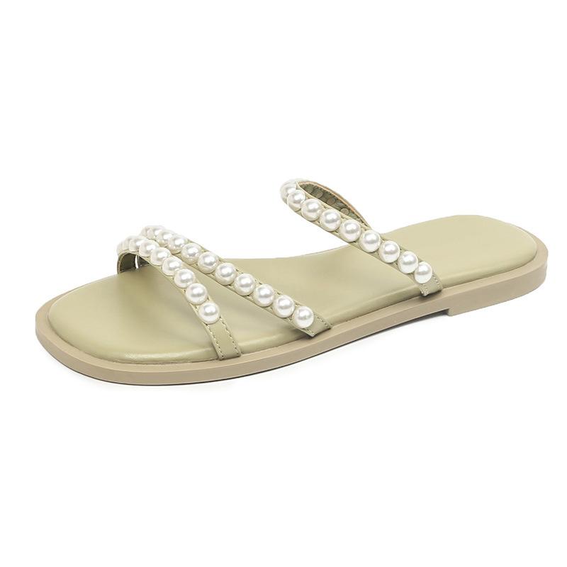 Модные шлепанцы с узким ремешком и жемчужными заклепками, женские сандалии на плоской подошве для лета и пляжа, размеры 41-43 плюс сайз, расшитые бисером шлепанцы, женские уличные шлепки 5 зелёный
