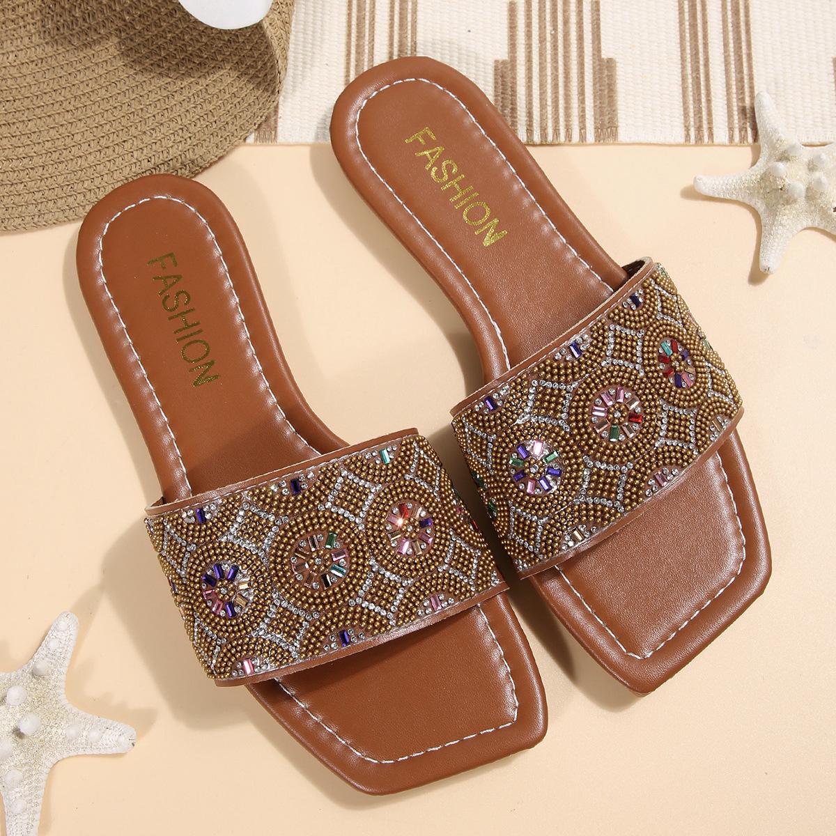Модные яркие бриллиантовые шлепанцы на плоской подошве 2025 лето новые шлепанцы больших размеров с квадратным носком удобная мягкая подошва сандалии на перемычке 35 светло-коричневого