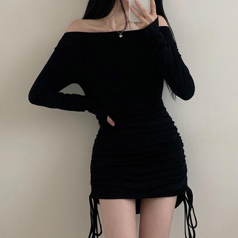 Модный стиль INS, однотонный шнурок, плиссированная тонкая короткая юбка с открытыми плечами, платье с открытыми плечами, черные юбки с ягодицами L чёрный