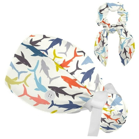 Working Cap with Buttons and Sweatband Scrub Hat Bouffant Caps with Scrunchie sharks silhouettes Tie Back Hats