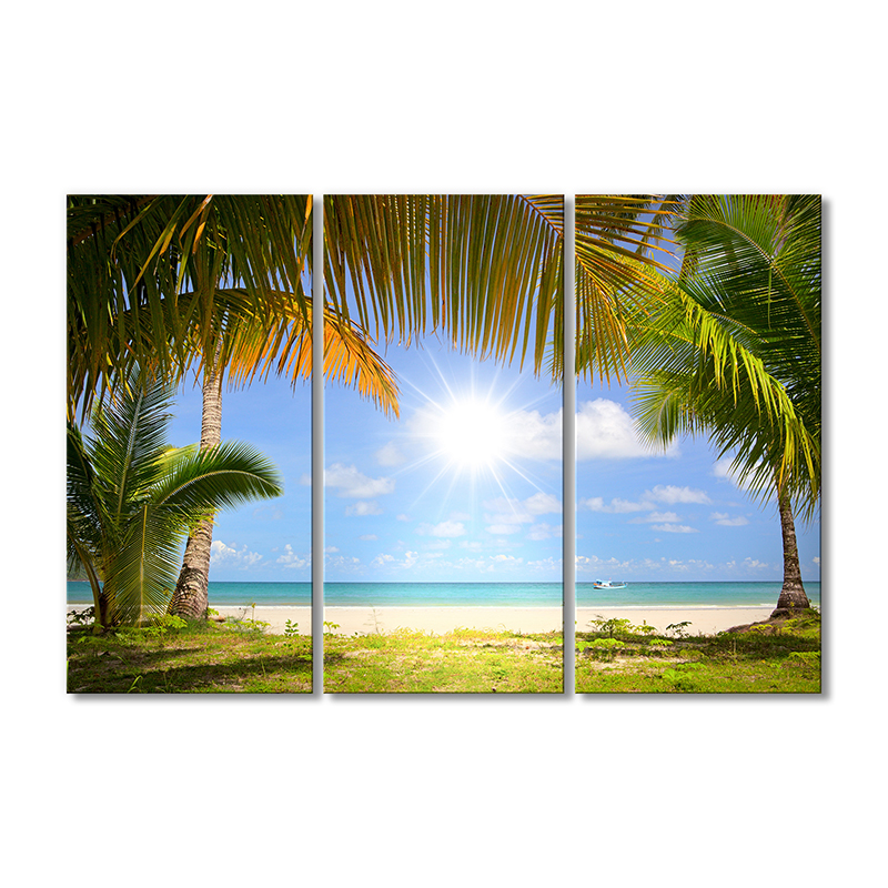 Модульная картина Artel «Вид через пальмы на корабль в море, голубое небо и солнце» 3 модуля 120x180 см