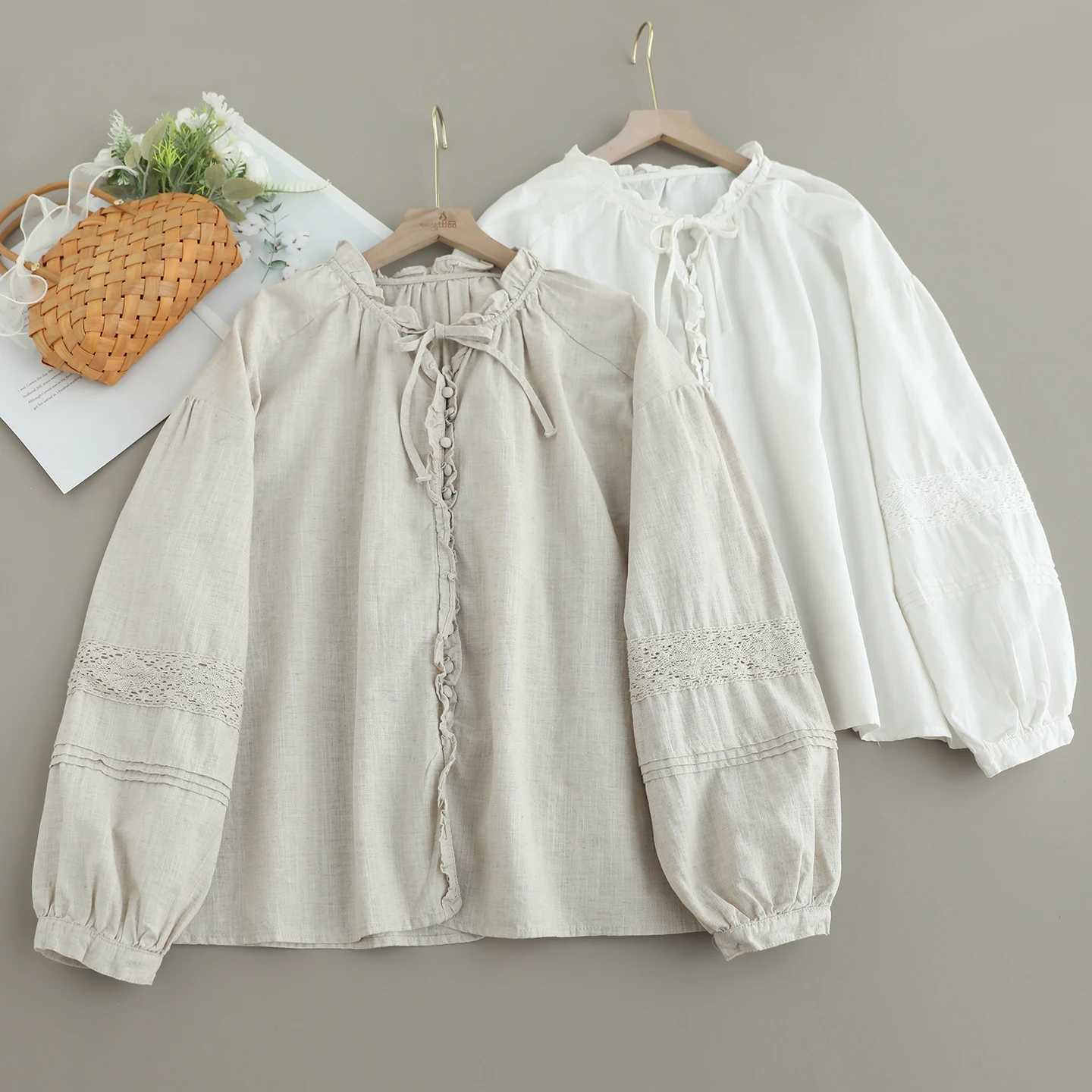 Японские винтажные однотонные хлопковые льняные рубашки Mori Girl, женские осенние повседневные блузки на шнуровке с воротником-стойкой и длинными пышными рукавами