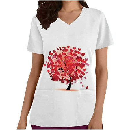 YWDJ Valentine s Day Scrub Tops for Women Plus Size Hearts Print with V Neck Short Sleeve White S