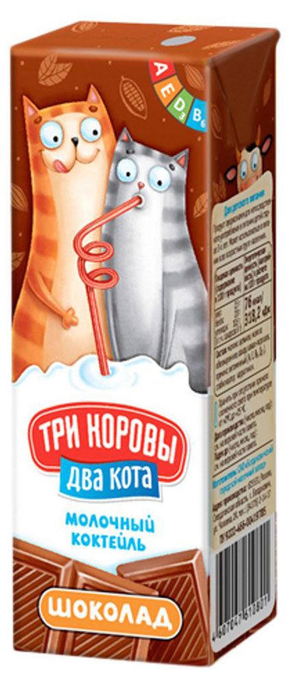 Молочный коктейль Три Коровы Два Кота Шоколадный с какао 2.5%, 200 мл