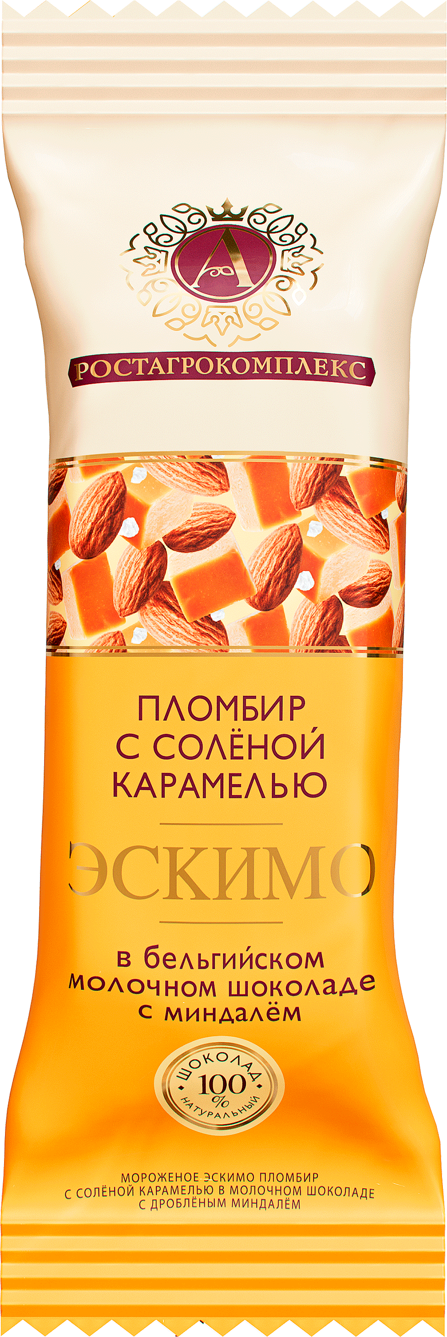 Мороженое А. Ростагрокомплекс эскимо пломбир солёная карамель в молочном шоколаде с миндалем