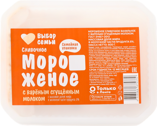 Мороженое Выбор Семьи Сливочное ванильное с вареным сгущенным молоком 8%, без змж, контейнер, 800 г