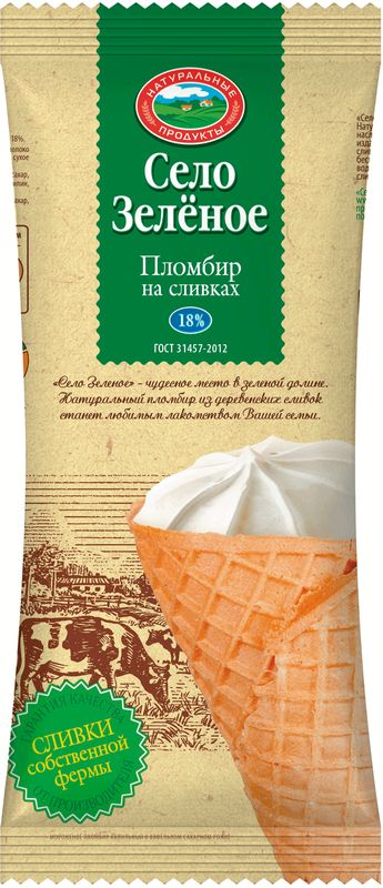 Мороженое СЕЛО ЗЕЛЁНОЕ Пломбир с ароматом ванили 15%, без змж, вафельный рожок 110 г