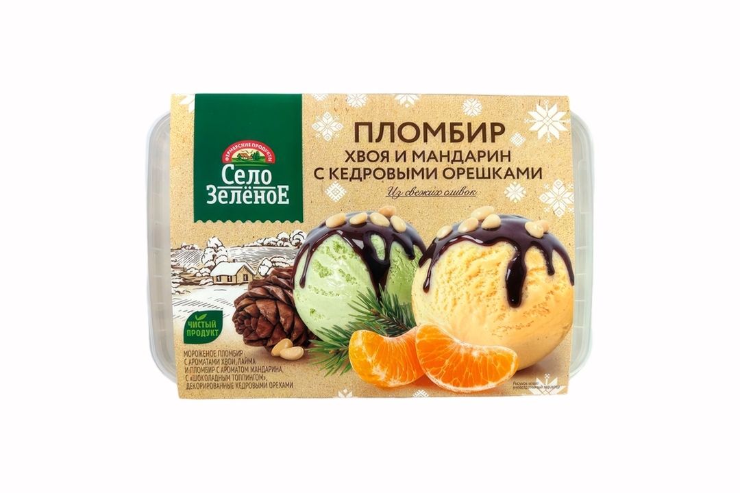 Мороженое Село Зелёное пломбир с ароматом хвои, лайма и пломбир с ароматом мандарина с шоколадным топпингом 15%, 450 г
