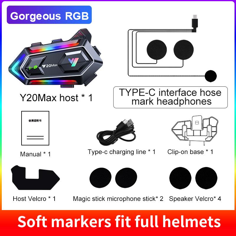 Мотоциклетная гарнитура для шлема BT5.3 Стерео, 300M Интерком, 16 RGB-подсветка, 1000 мАч, Водонепроницаемость IPX6, Сопряжение с двумя телефонами, Голосовое управление Soft MIC
