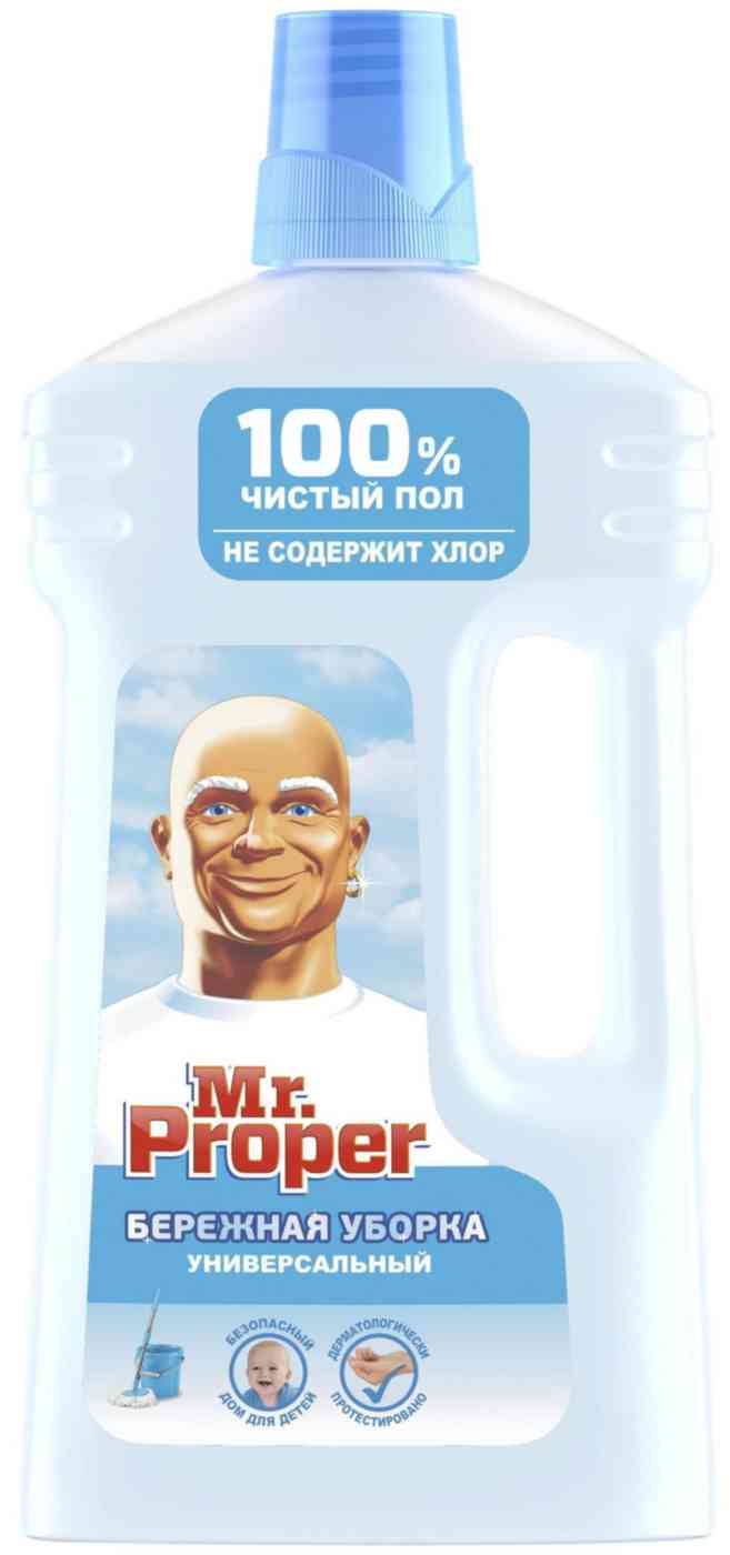 Моющая жидкость для полов и стен Mr. Proper Бережная уборка отмывает полы и стены за меньшее время и с меньшими усилиями. Благодаря безопасной рН формуле подходит для различных поверхностей, включая лакированные полы и ламинат. Без запаха. Рекомендовано для домов с детьми и домашними животными. Одобрено педиатрами.
