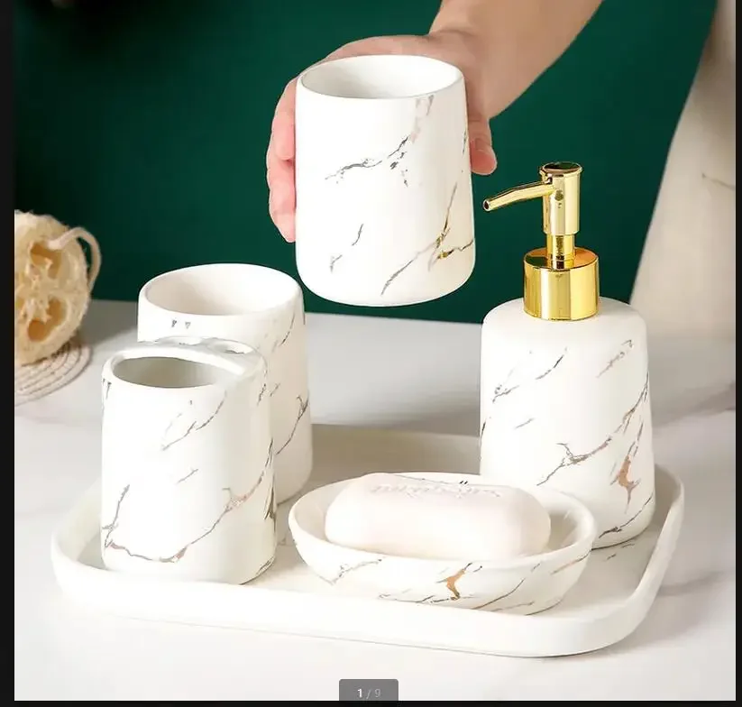 Мраморный керамический набор из 5 предметов для ванной комнаты с подносом, набор чашек для рта, принадлежности для мытья ванной комнаты, бутылка для лосьона, держатель для зубной щетки, мыльница