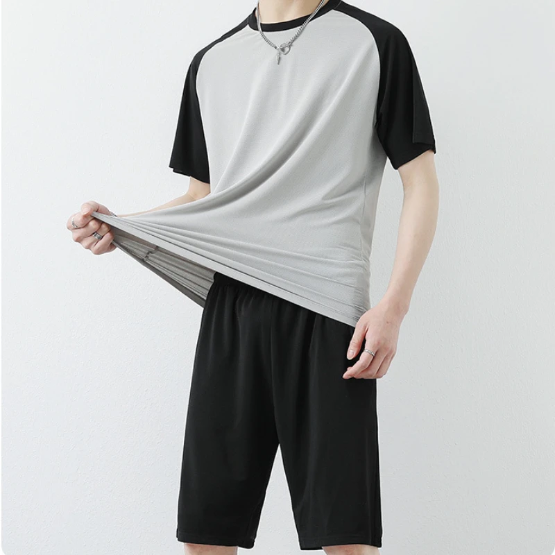 Мужская Летняя Повседневная модель 2023, Модная тонкая дышащая ткань с круглым вырезом, в стиле пэчворк, Корейская свободная одежда из 2 предметов, черная новая одежда