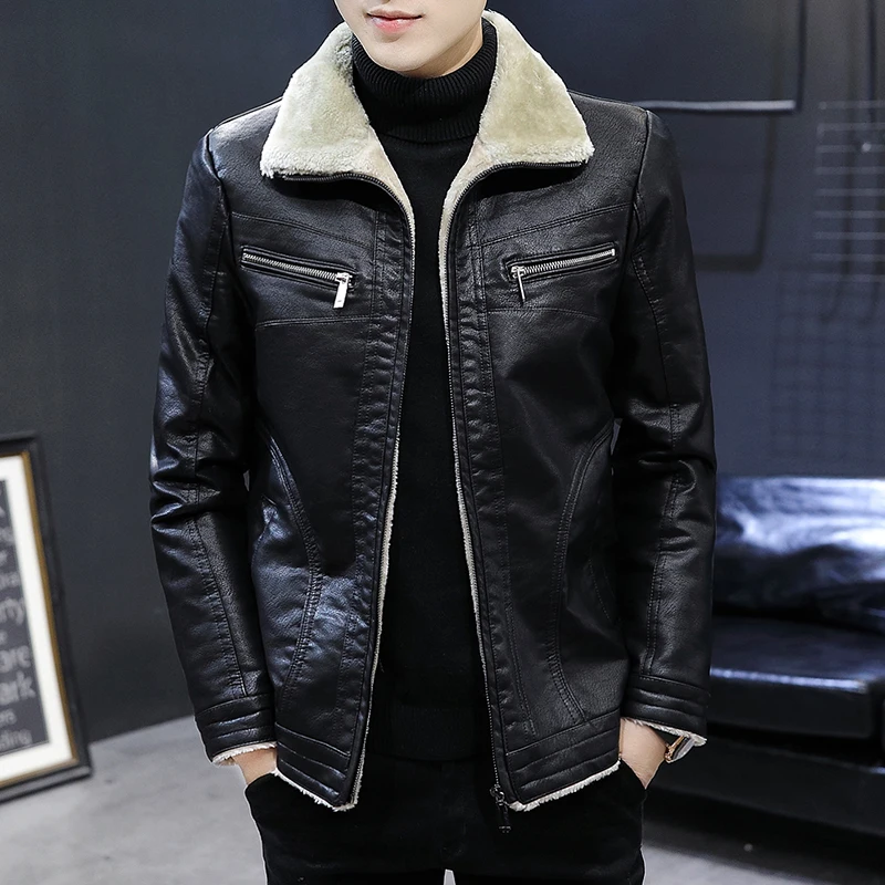 Мужская зимняя кожаная куртка, однотонная бархатная деловая куртка средней длины с лацканами, сохраняющая тепло черная кожаная ветровка, модель 2023 года