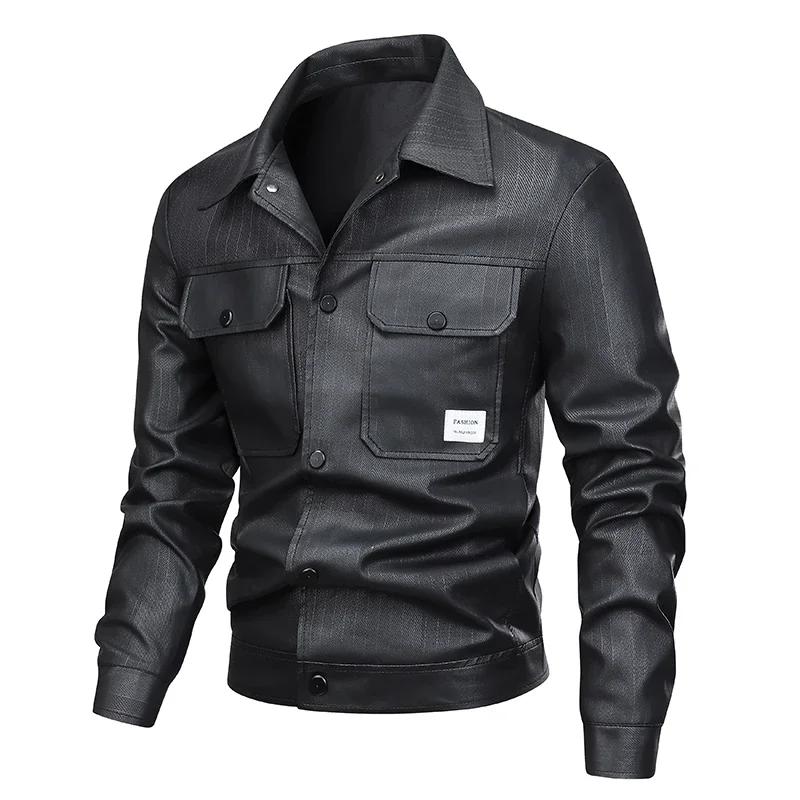 Мужская кожаная куртка для бизнеса Осень Зима Повседневная из ПУ кожи Байкерские куртки для мужчин Винтажная мотоциклетная куртка Модное пальто с лацканами M чёрный
