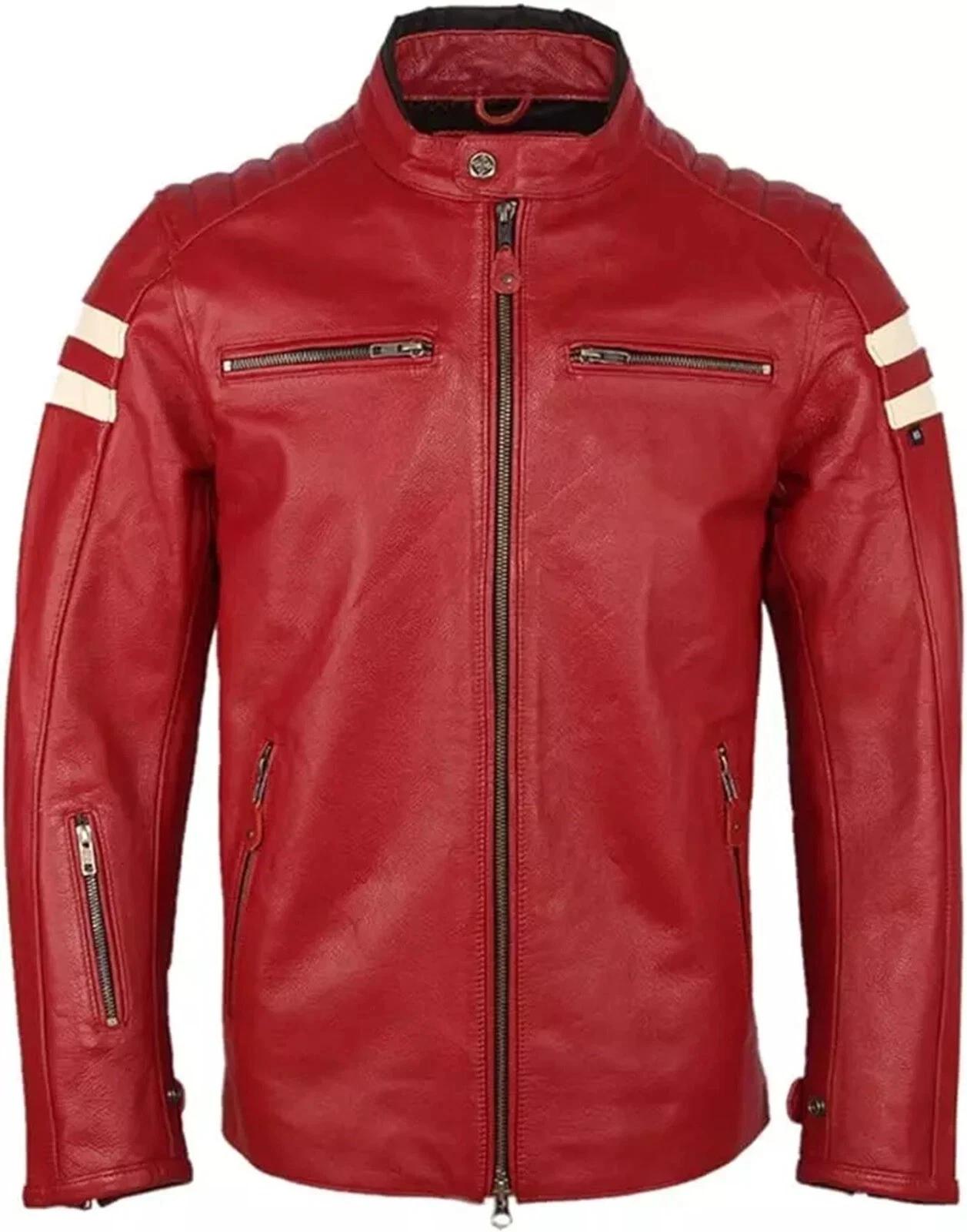 Мужская куртка Красная овчина Байкер Мотоциклетная Белая полоса Стильная Натуральная кожа Ручная работа 3XL
