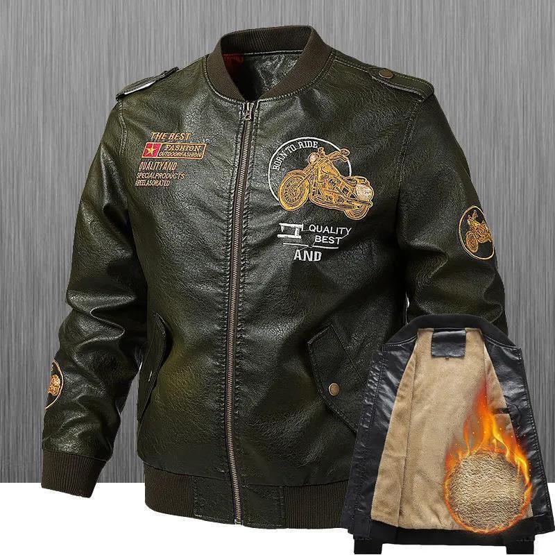 Мужская мотоциклетная куртка из искусственной кожи, зимняя толстая теплая кашемировая куртка, повседневная тонкая мотоциклетная куртка M армия зеленый