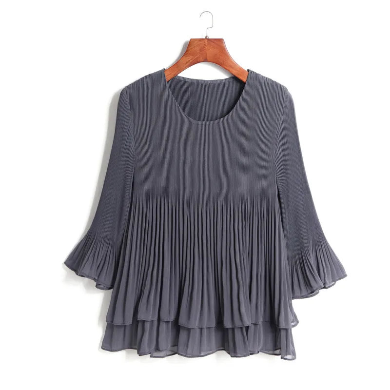 LANMREM Round Neck Flared Sleeve T-shirt Women Casual Pleated Top 2021 Summer Loose T-shirt Female Elegant YK166
