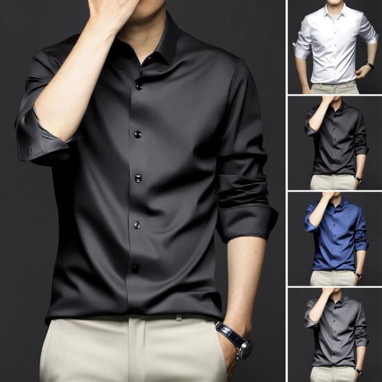 Мужская осенняя деловая рубашка, рубашка для официальных случаев, однобортная мужская рубашка с отложным воротником и длинным рукавом из шелковистой ткани, однотонная мужская рубашка средней длины 44 серый