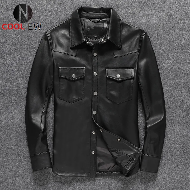 Мужская повседневная приталенная рубашка из натуральной кожи, черная однобортная тонкая весенняя рубашка из овечьей шкуры, модель размера ...