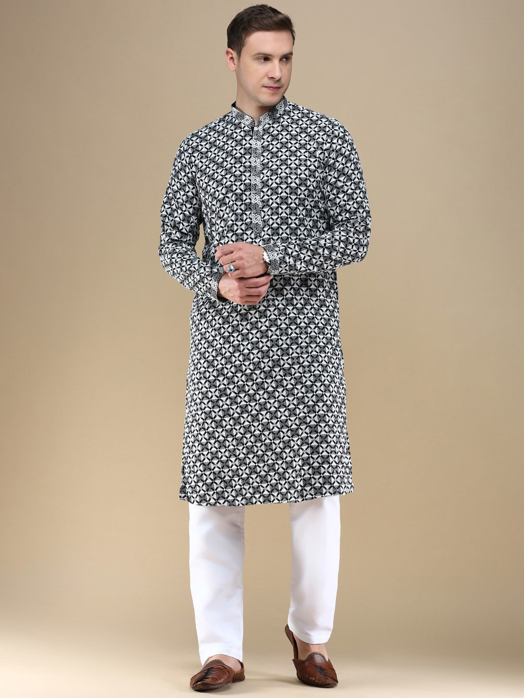 Anouk Mandarin Collar Long Sleeves Floral Embroidered Sequinned Straight Kurta with Pyjama, Black