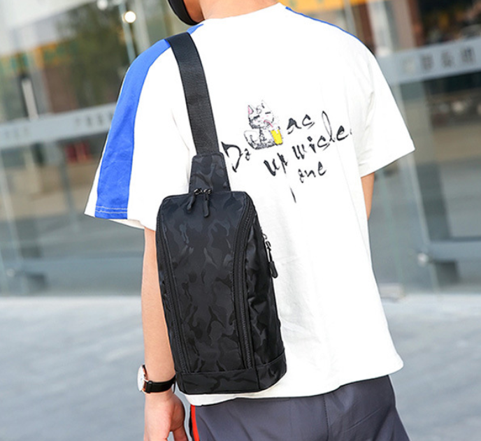 Сумка через плечо на грудь. Черный камуфляж. Застежка молния расположена вкруговую. Две позиции фиксации нижнего крепления плечевого ремня. Ткань Оксфорд