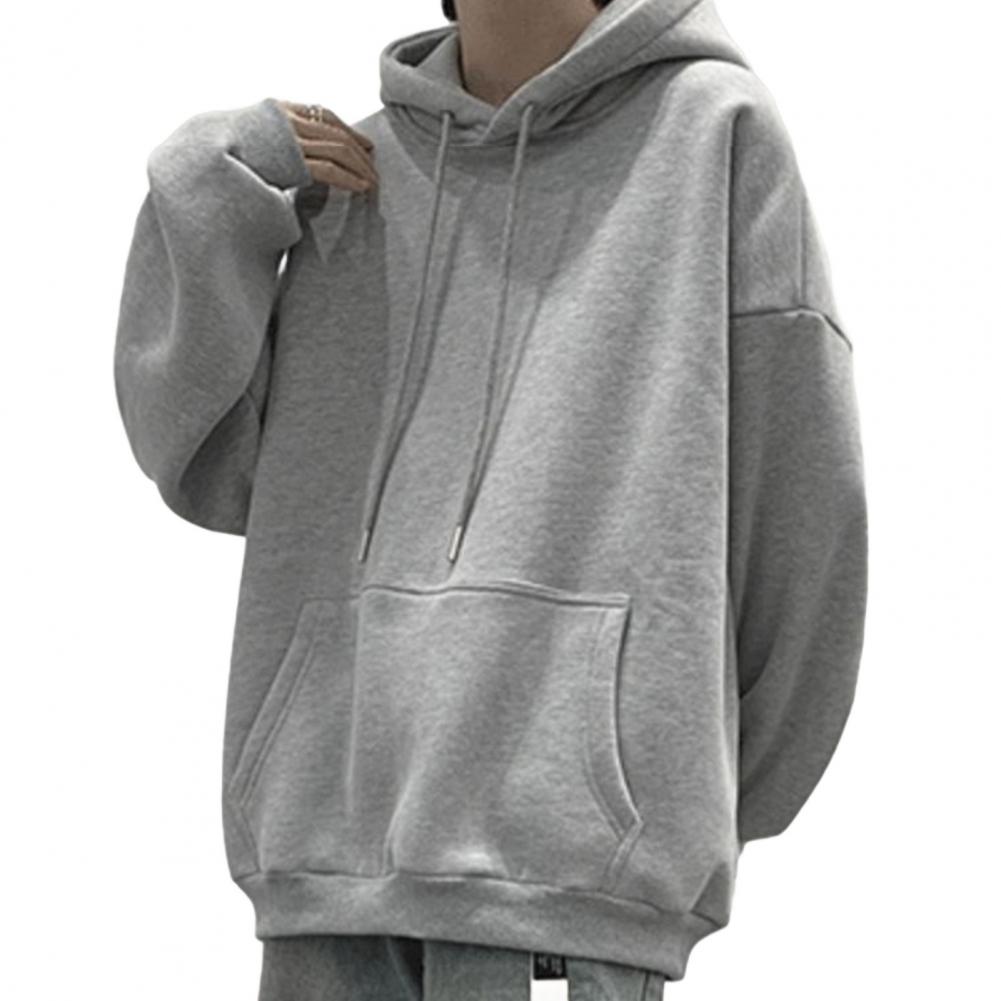 Мужская толстовка с капюшоном на осень-зиму с завязками, однотонная, эластичная манжета, толстая, большого размера, большой накладной карман, с капюшоном, свободная, сохраняет тепло, средней длины XL светло-серый