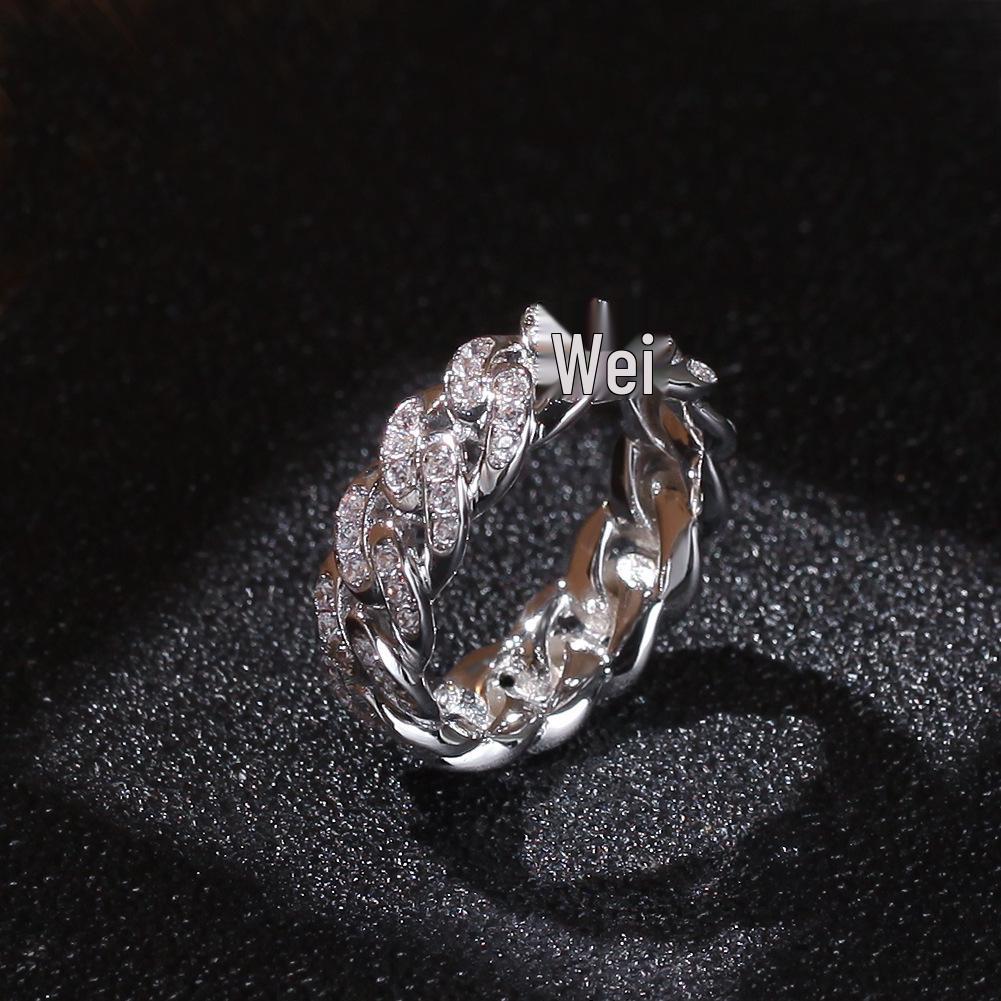 Мужское кольцо-цепь кубинского плетения с цирконами, с золотым покрытием 8 мм - Европейско-американский хип-хоп стиль Size 10 серебряный